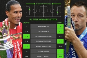 英超第一中卫?对比夺冠赛季:特里解围、零封、进球都比范戴克多